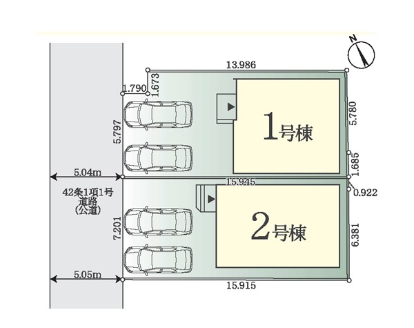 | 駐車場 | 2台 | 道路の幅員 | 1号棟:北西5m /2号棟:北西5m |