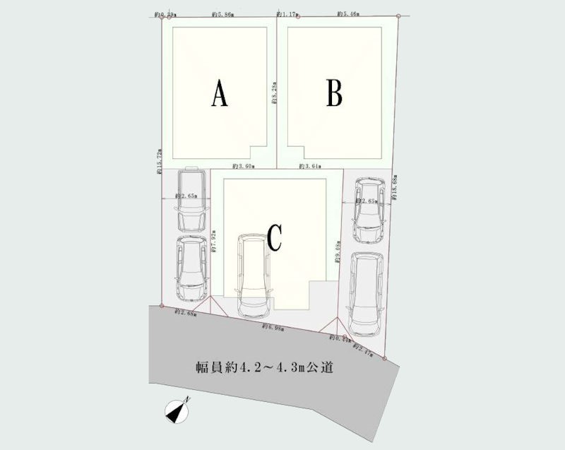 | 駐車場 | 2台 | 道路の幅員 | A号棟:南東4.2m /C号棟:南東4.2m |