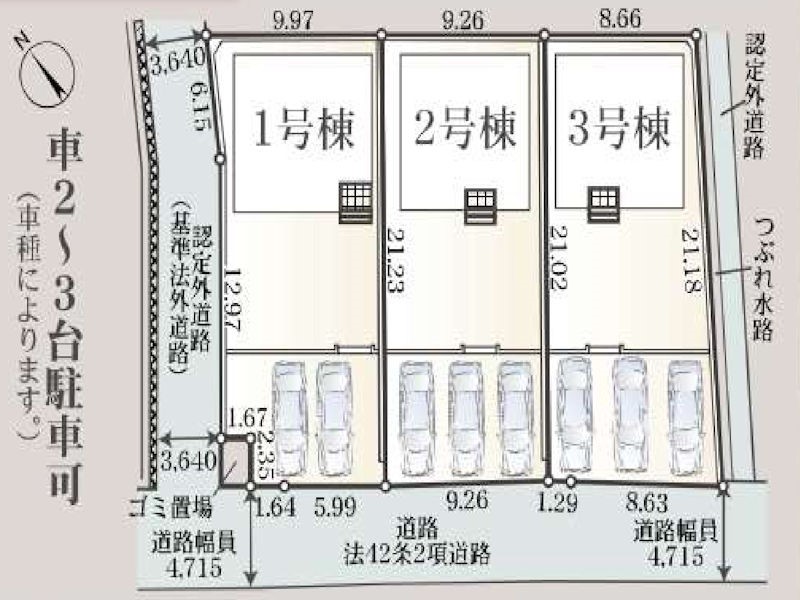 | 駐車場 | 2台 ~ 3台 | 道路の幅員 | 3号棟:南西4.7m /1号棟:南西4.7m |