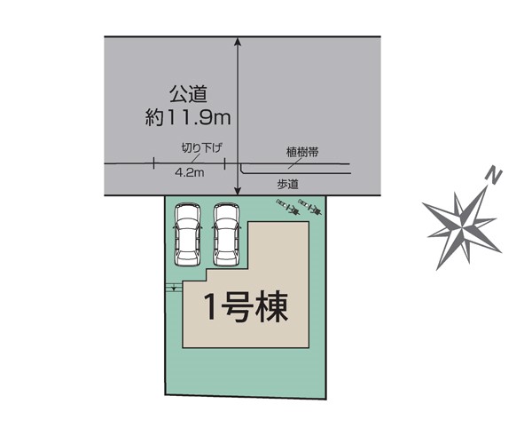 | 駐車場 | 2台 | 道路の幅員 | 1号棟:北11m |