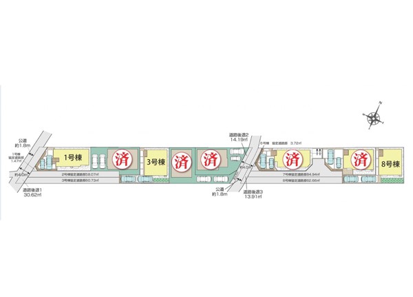 | 駐車場 | 2台 | 道路の幅員 | 1号棟:西1.8m /8号棟:西1.8m /3号棟:西1.8m |