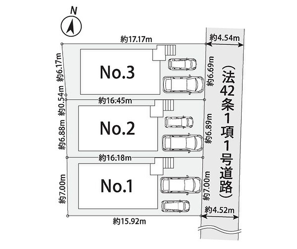 | 駐車場 | 2台 | 道路の幅員 | 1号棟:東4.5m |
