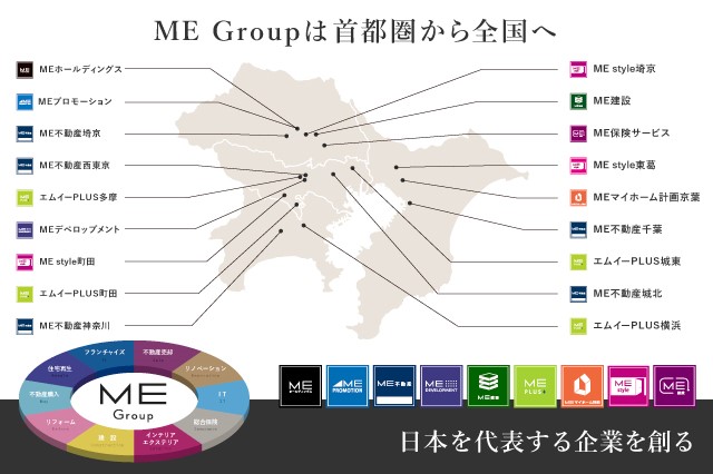 くらしを楽しむ世の中を、もっと。 首都圏に広がるME Group2025年グループ成約2271件の実績の実績 他に建設・住宅設備・保険・IT等「くらし」をテーマに事業を展開