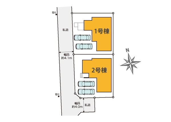 | 駐車場 | 2台 | 道路の幅員 | 2号棟:西4.1m 南4m /1号棟:西4.1m |