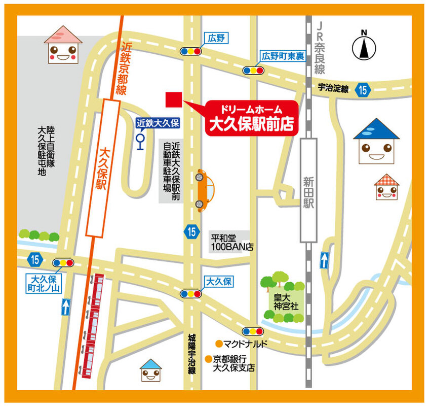 JR奈良線「新田」駅 徒歩11分 近鉄京都線「大久保」駅 徒歩15分 |