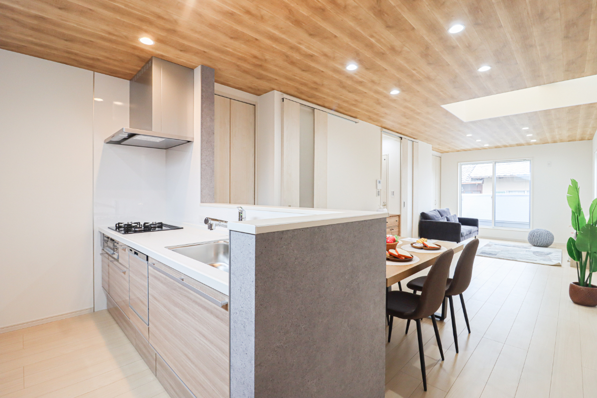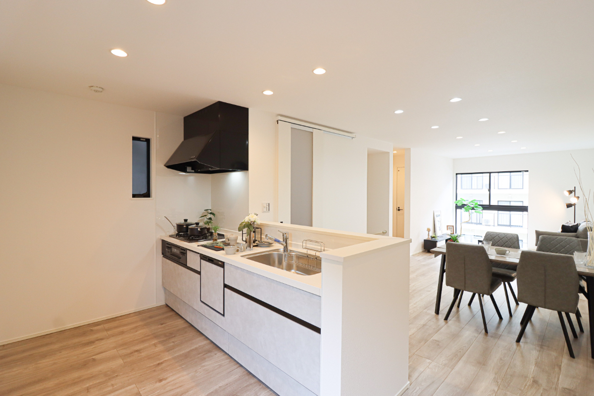 ◆正面に遮るものがない対面キッチンで、リビングルームにいるご家...