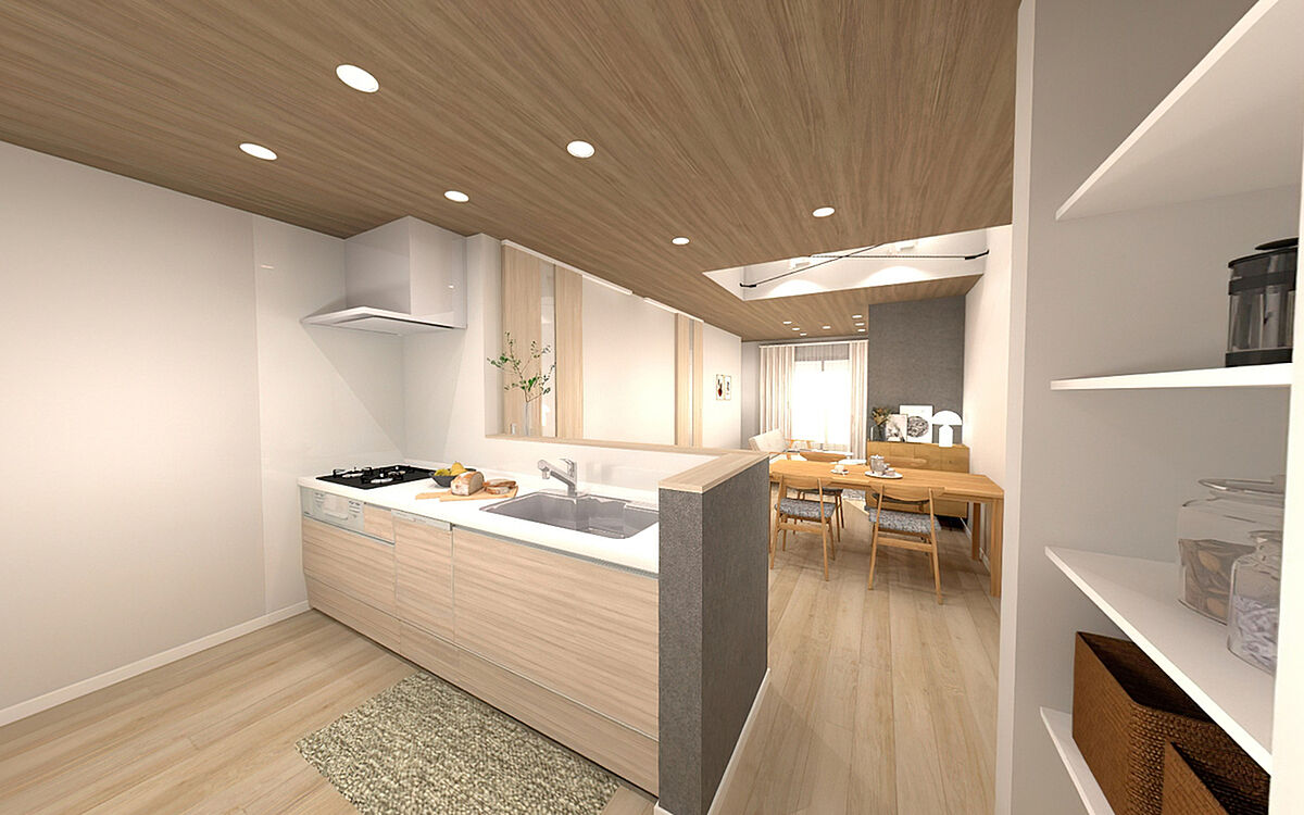 ■正面に遮るものがない対面キッチンで、リビングルームにいるご家...