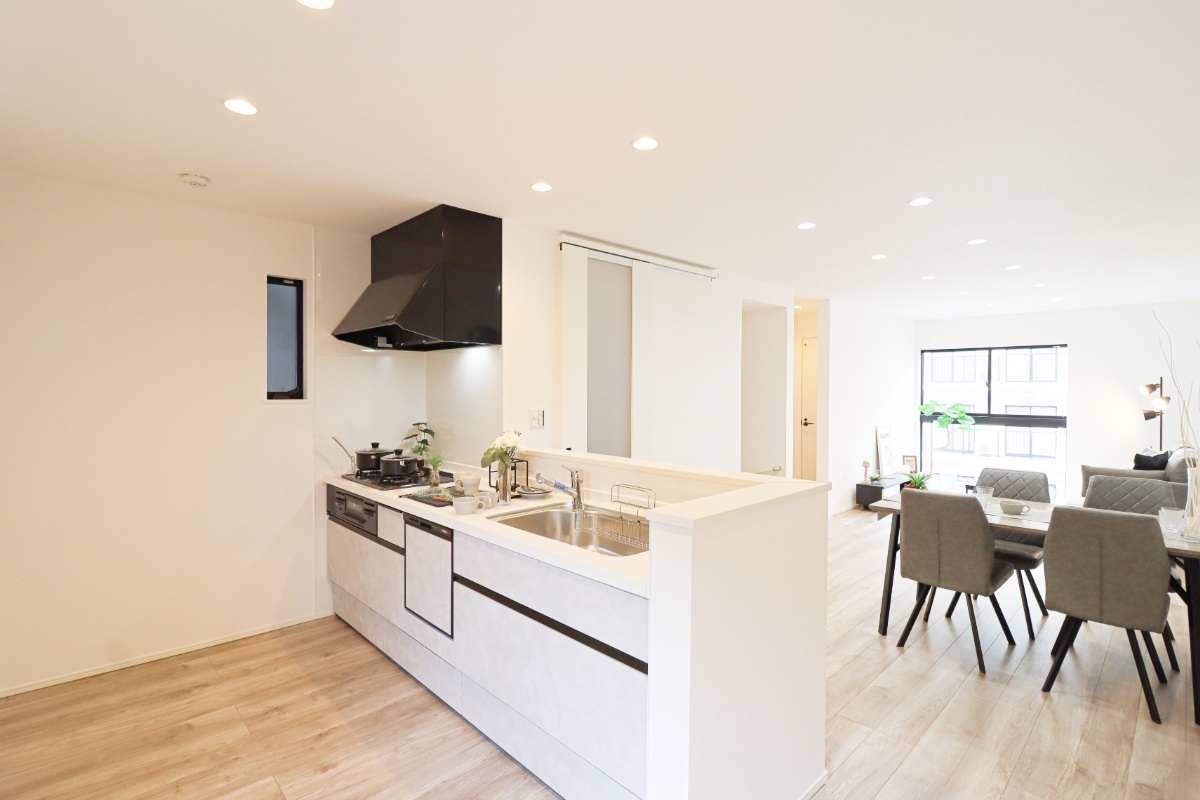 ■対面キッチンは料理をしながらリビングを見渡せ、家族との会話も...