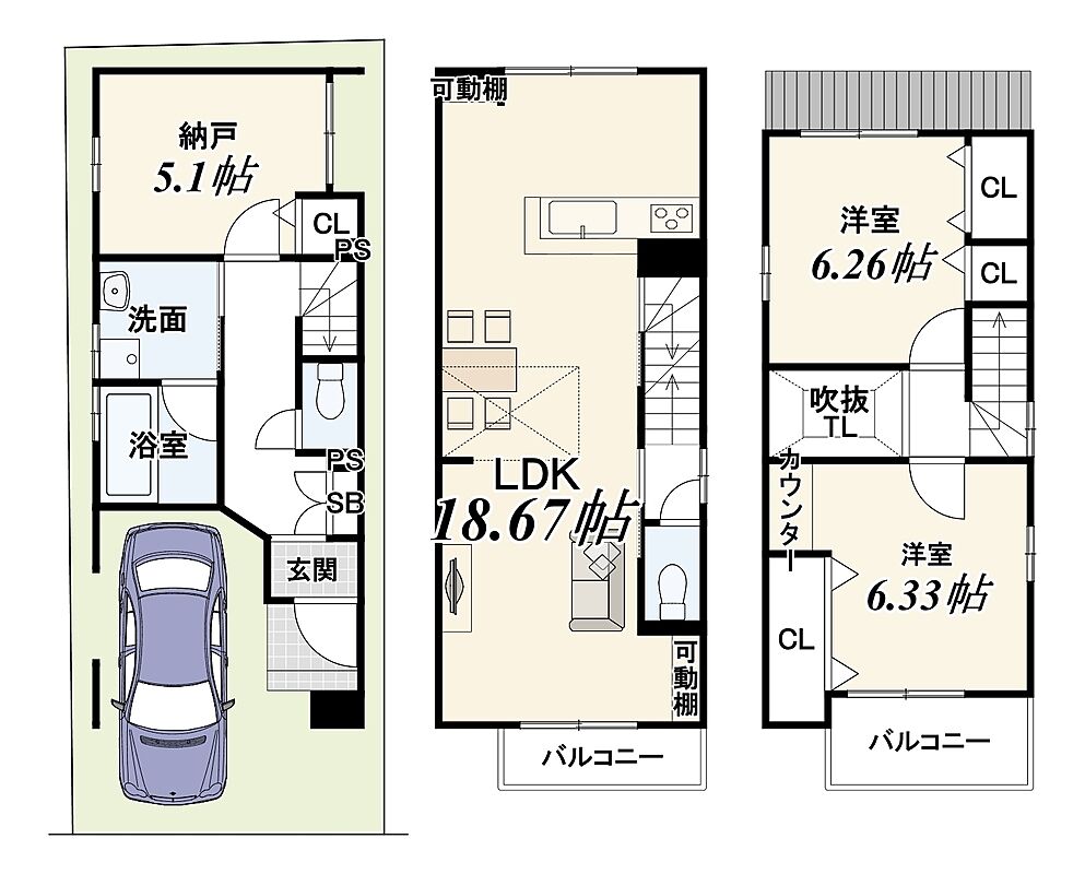 | 建物面積 | 99.79m2 | 土地面積 | 実測51.75m2(15.65坪) |