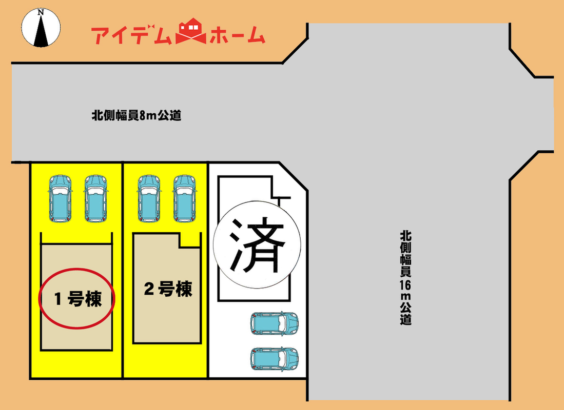 | 駐車場 | 1台 ~ 2台(駐車2台可) | 道路の幅員 | 東側幅員16m公道、北側幅員8m公道 |