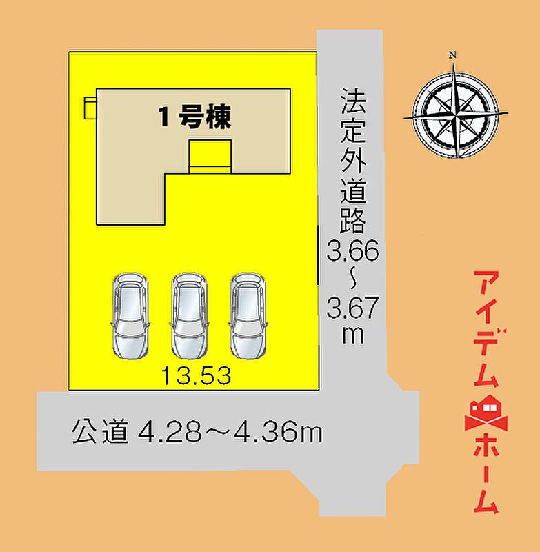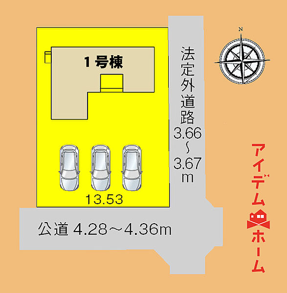 | 駐車場 | 駐車3台可能 | 道路の幅員 | 南側4.28m公道、東側幅員3.66m私道 |
