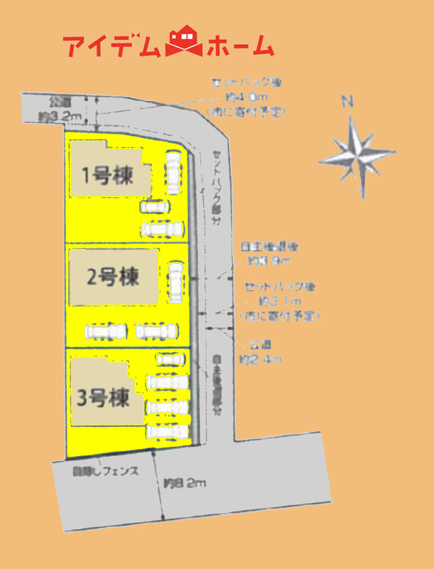 | 駐車場 | 駐車3台可能(1.2号棟)・駐車4台可能(3号棟) | 道路の幅員 | 北側幅員3.2m公道、東側幅員2.4m公道 |