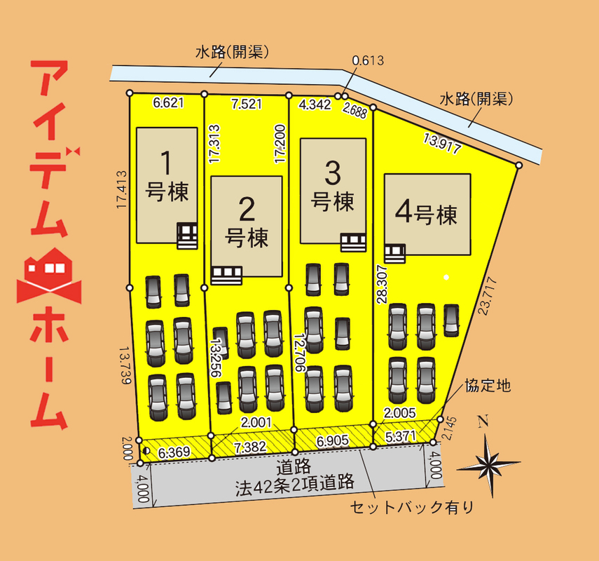 | 駐車場 | 駐車5~6台可能(車種・号棟による) | 道路の幅員 | 南側幅員3.1m公道(セットバック有) |