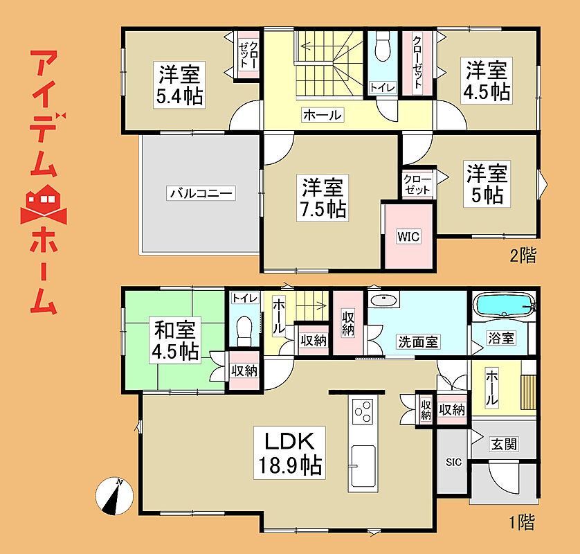 2階全居室6帖!WIC等収納豊富な間取り!6.1帖の広々バルコニー!