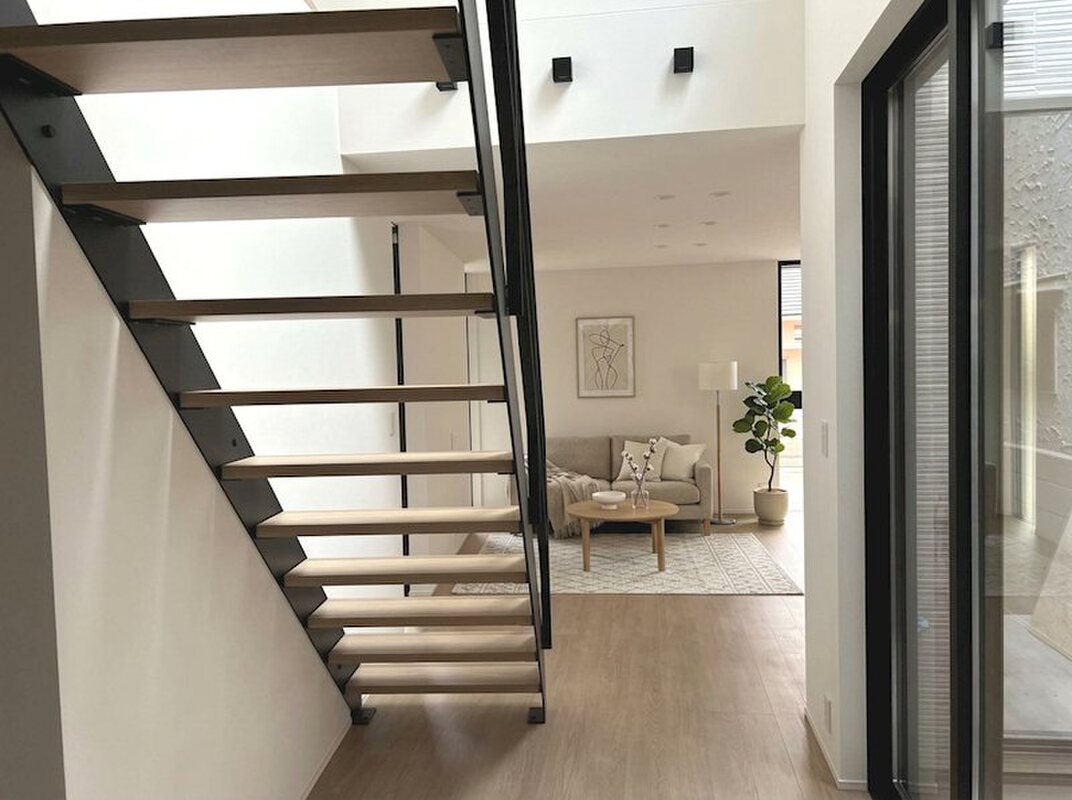 LDKテラス-吹抜け鉄骨階段-DEN