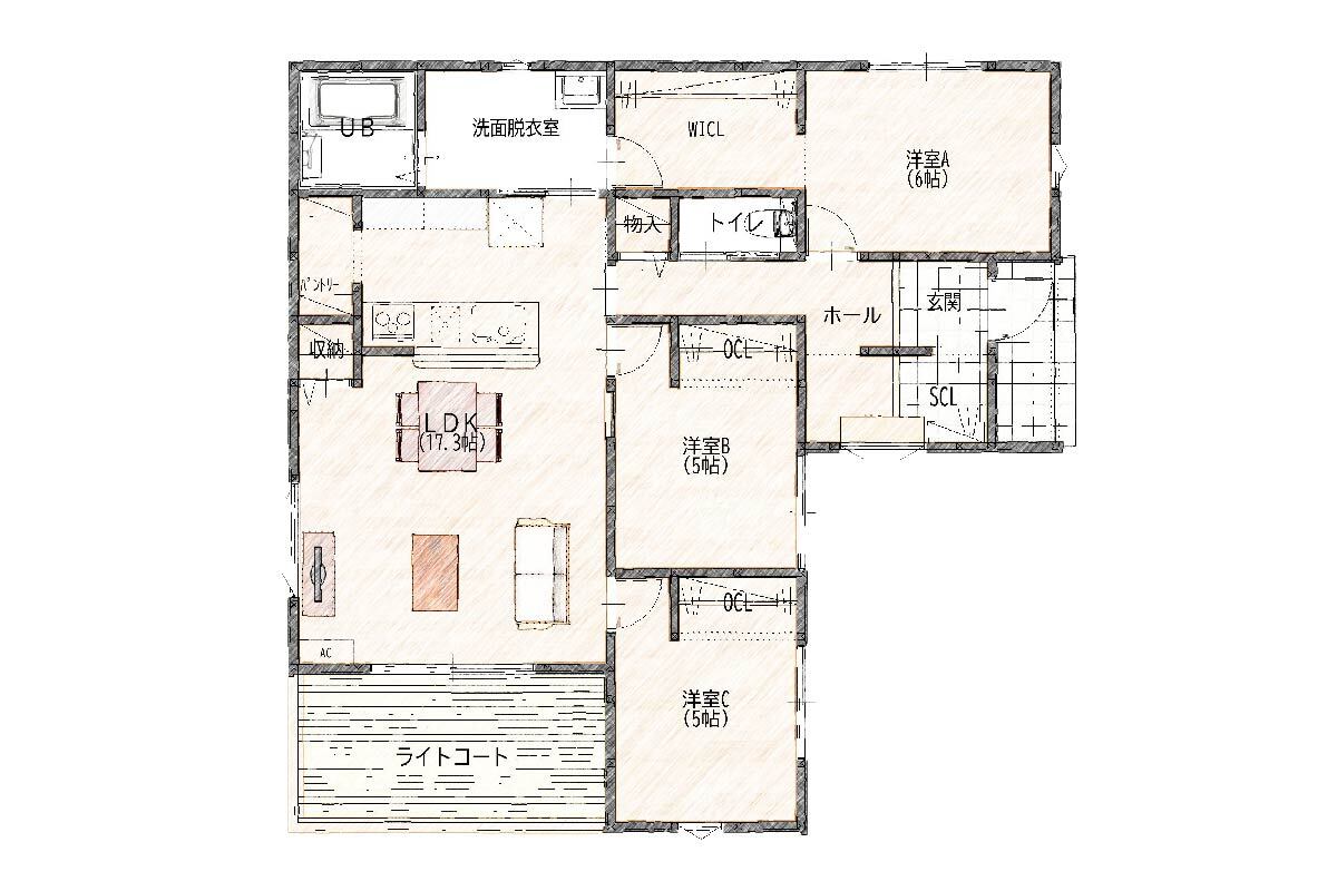 【暮らしやすさ】LDK17.3帖の広々空間に加え、3つの個室で家族のプライベートも確保された間取り。