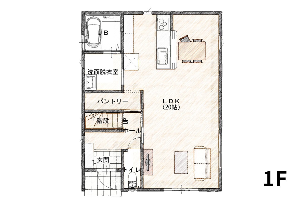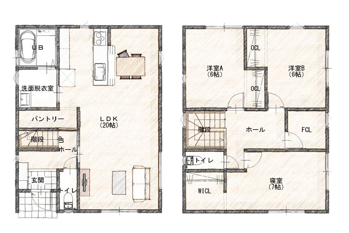 20帖の広々LDKにパントリーやWICL付きで、収納力も抜群。家事動線が良く、忙しいママも快適に過ごせる間取りです。
