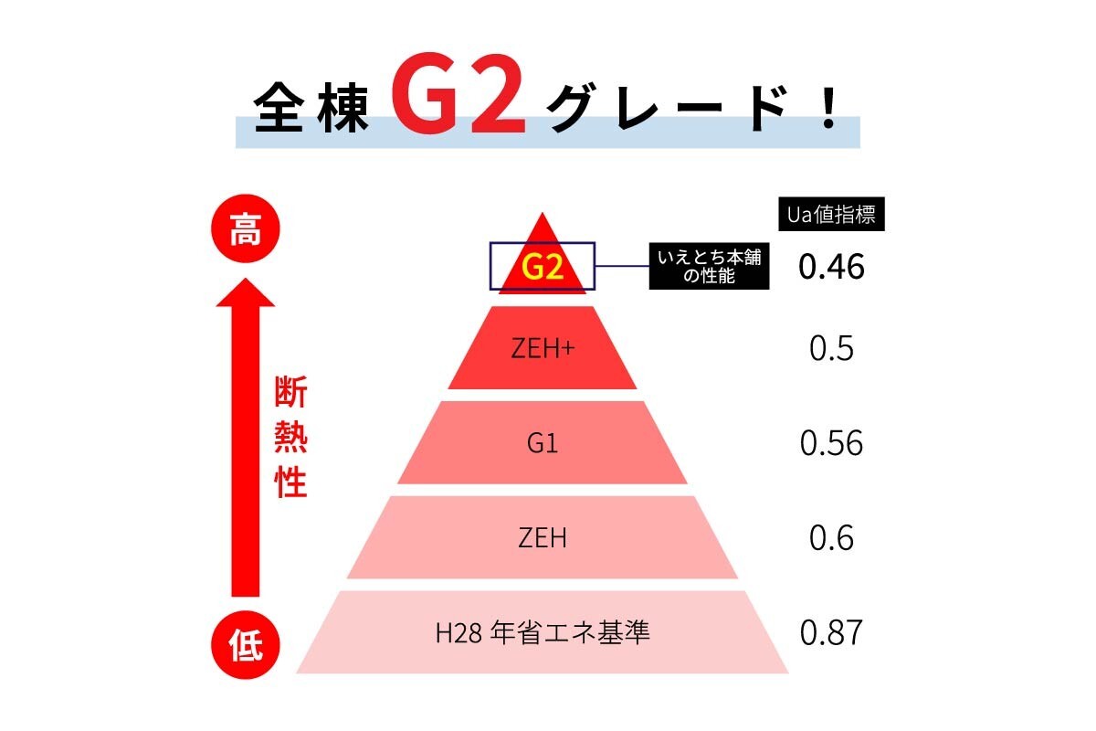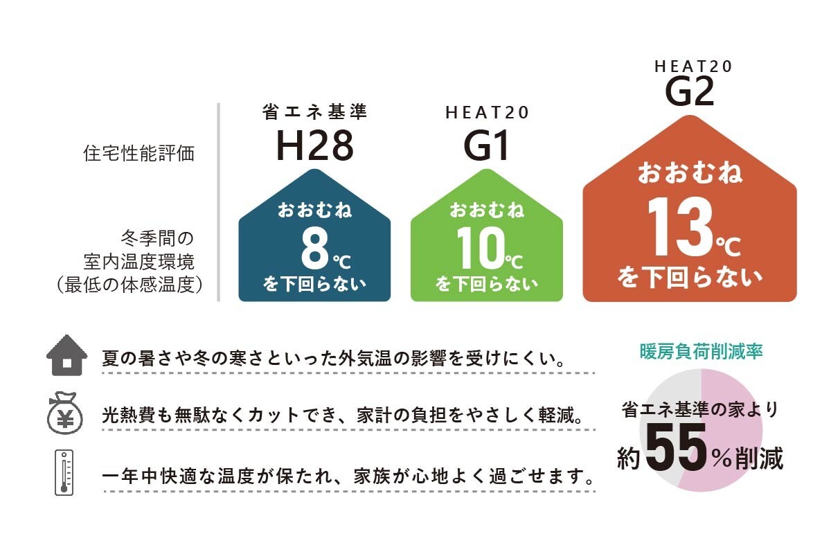 断熱性能の指標であるG2グレードに対応し、外気温の影響を受けにくい快適な住まいを実現。冷暖房効率が高まり、室内は年中過ごしやすく、光熱費も大幅に削減できます。G2基準を超える断熱性で、将来のエネルギーコストにも備えた安心設計。ヒートショックのリスク軽減にもつながり、ご家族の健康にも配慮した住まいです。