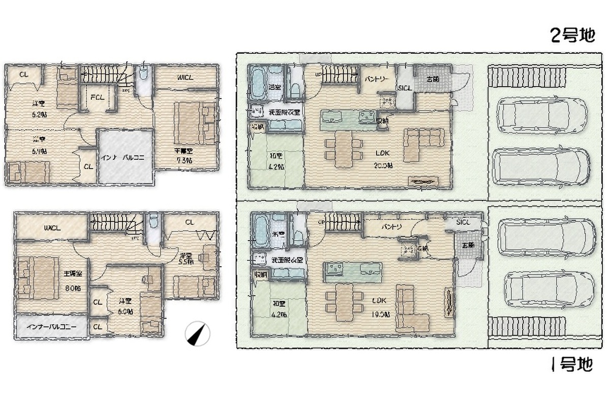 | 建物面積 | 118.41m2(1号地)、119.01m2(2号地) | 土地面積 | 135.47m2(1号地)、135.41m2(2号地) |