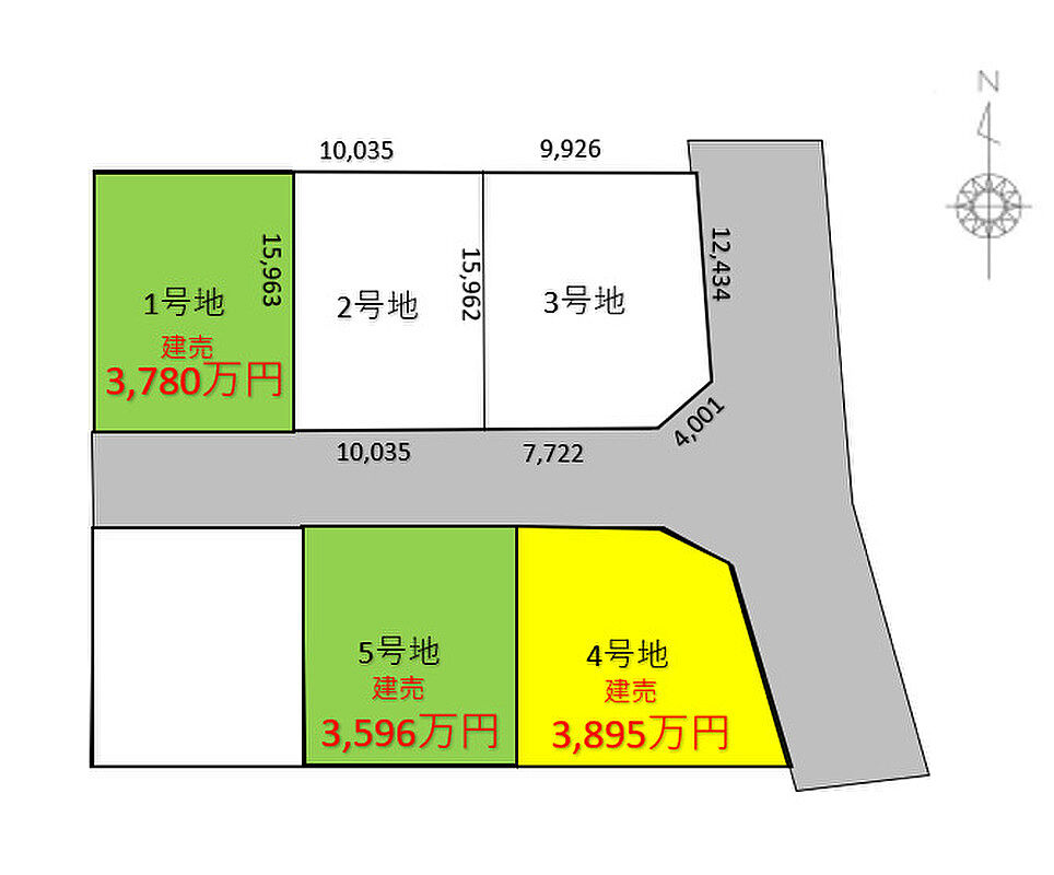 | 駐車場 | 2台 ~ 3台(1号地(2台)・4号地(3台)・5号地(3台)) | 道路の幅員 | 南側幅員6m、東側幅員6m、北側幅員6m他備考欄参照 |