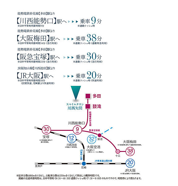 ・現地より宝塚まで約40分、大阪梅田まで約45分なので通勤通学にも。