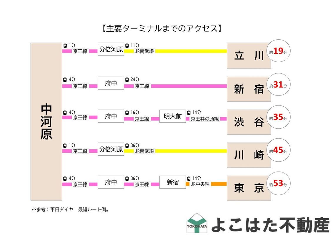 京王線「中河原」駅 徒歩20分 京王線「聖蹟桜ヶ丘」駅 車2.8km JR南武線「西府」駅 車2.6km |