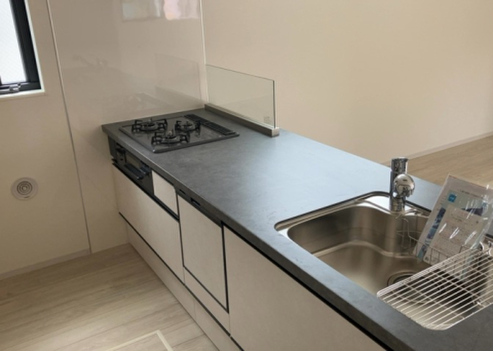 システムキッチン付きの物件でカラーリングも統一できるため見た目に一体感が生まれ、美しいです。顔が見える安心のTVインターホン付きです。新築の戸建て物件です。