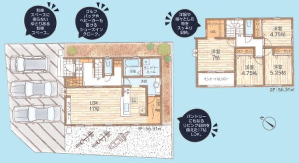 - ※完成予想図やCG合成画像は、門塀・植栽・庭・外観等、実際とは多少異なる場合があります。
