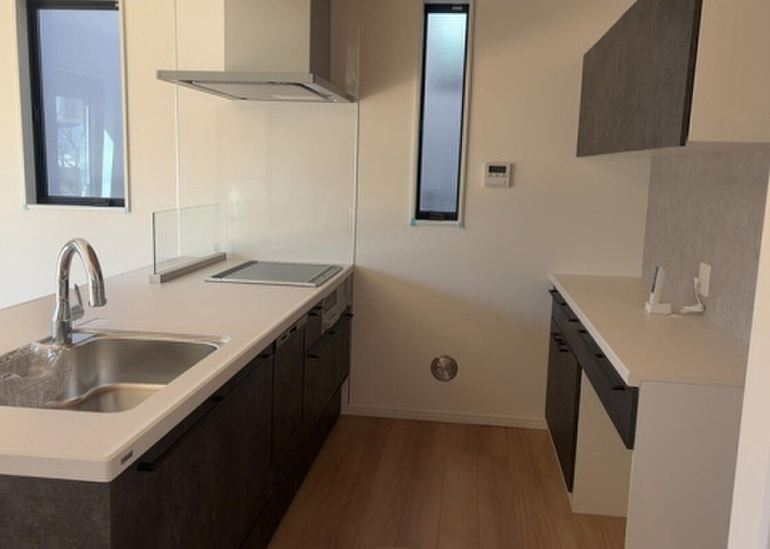 簡単にお手入れができるIHキッチンです。システムキッチンは必要な物が組み込まれているため、すぐ調理できます。TVインターホン付きなので、女性の方も安心です。ものが多くサービスルームが欲しい方にも嬉しい3SLDK。新築戸建てで新生活を始めてはいかがでしょうか。入浴時間を気にする必要のない追焚機能のある浴室です。建物面積100.19平米なので、使い勝手がいいです。