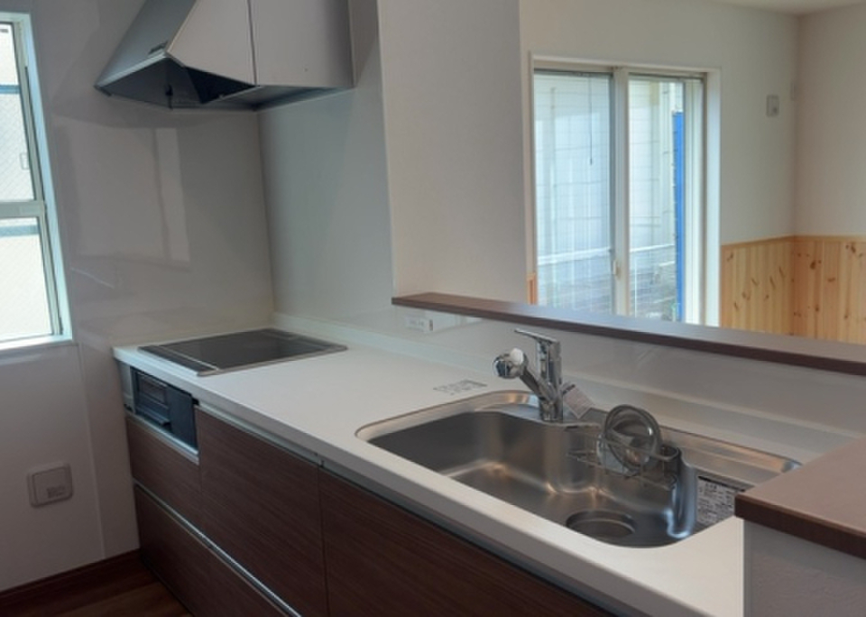動線を意識したデザインのシステムキッチン付きで作業能率が上がります。新築の戸建て物件です。IHクッキングヒーター付きのキッチンです。