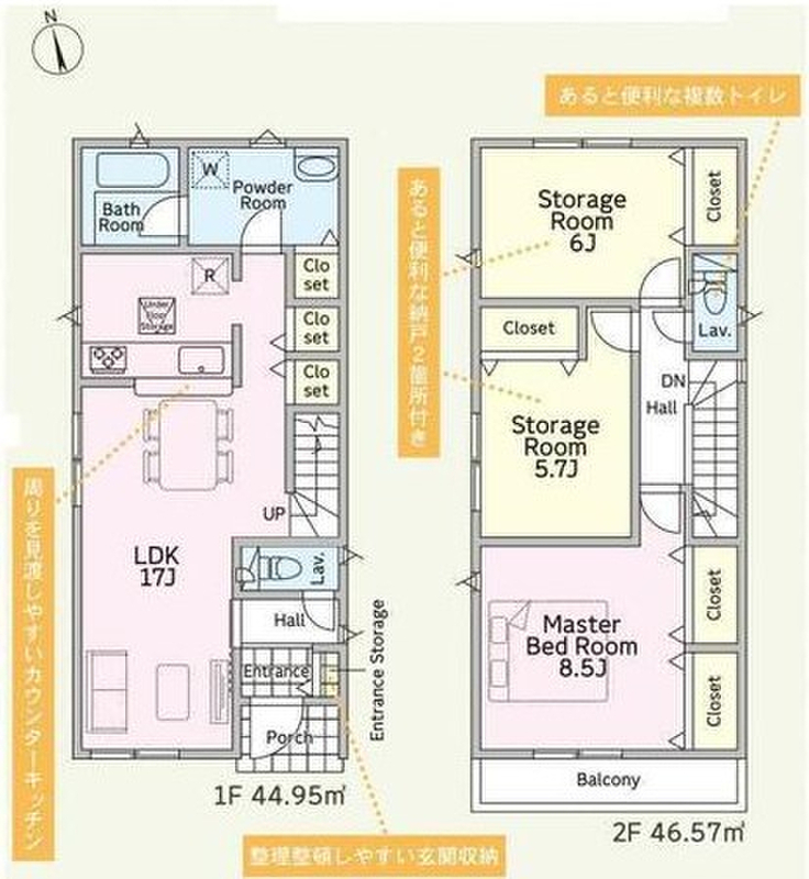浴室乾燥機付きの物件なので、外に干したくない日でも浴室乾燥機を利用してバスルームに干せば効率よくカラッと乾きます。シューズボックス付きなので、ご家族みんなの靴も整頓できます。新築の戸建てで気分爽快な生活を送りましょう。さし湯をせずに沸かし直すことができる追焚機能付きの浴室です。素敵なデザインでゆとりのある生活ができる2LDK。建物面積91.52平米なので、使い勝手がいいです。