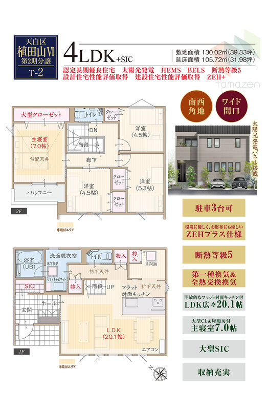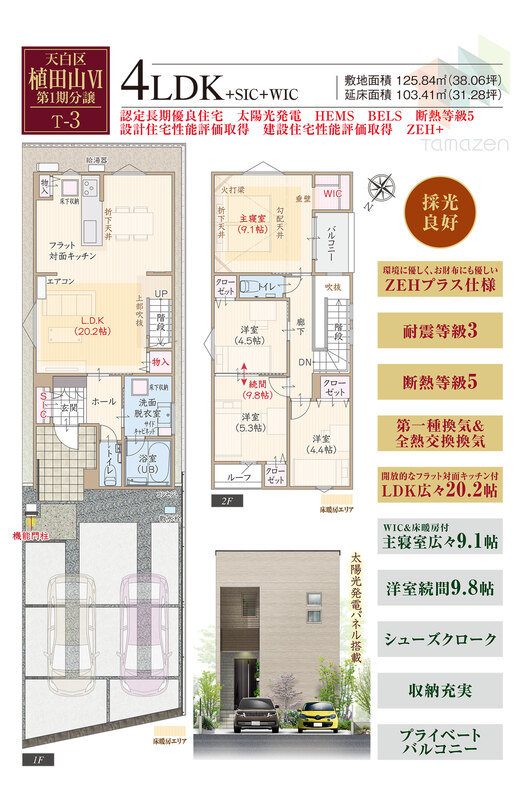 | 建物面積 | 103.41m2・105.72m2(31.28坪・31.98坪) | 土地面積 | 125.84m2・130.02m2(38.06坪・39.33坪) |