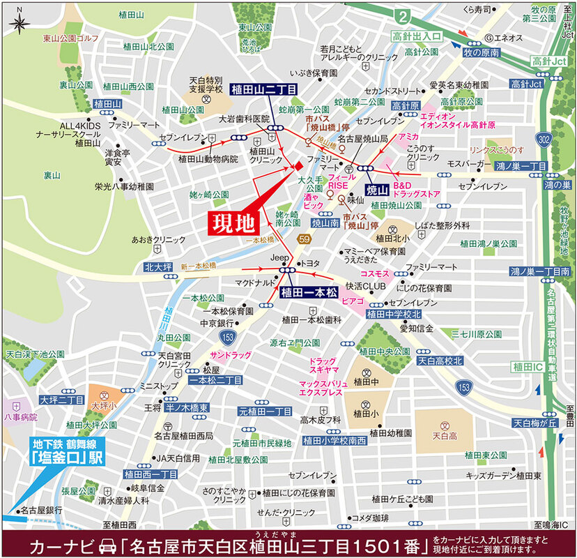 名古屋市営鶴舞線「塩釜口」駅 徒歩23分 名古屋市営鶴舞線「植田」駅 徒歩27分 市営バス「焼山橋」停 徒歩2分 (地下鉄星ケ丘駅、塩釜口駅、植田駅・八事日赤病院行き) |