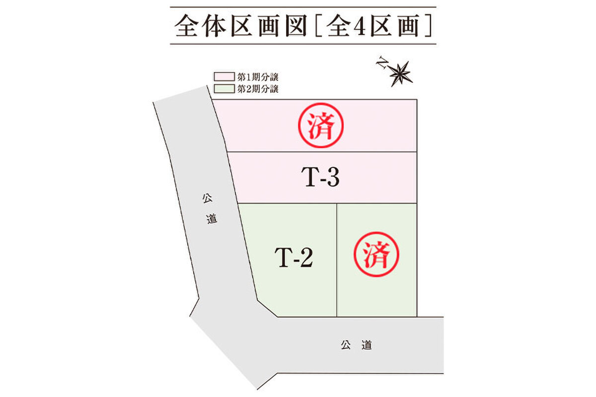 | 駐車場 | 2台 ~ 3台(T-2棟(3台)、T-3棟(2台)) | 道路の幅員 | 北西側公道6.5m・南西側公道6.5m |
