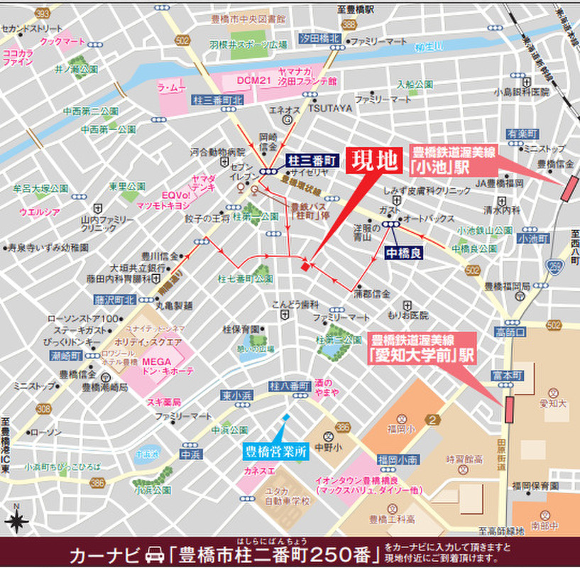 豊橋鉄道渥美線「愛知大学前」駅 豊鉄バス「柱町」停 徒歩5分 豊橋鉄道渥美線「小池」駅 徒歩15分 豊鉄バス「柱町」停(豊橋駅・ユタカ自動車学校・デンソー豊橋製作所行き) 徒歩5分 |