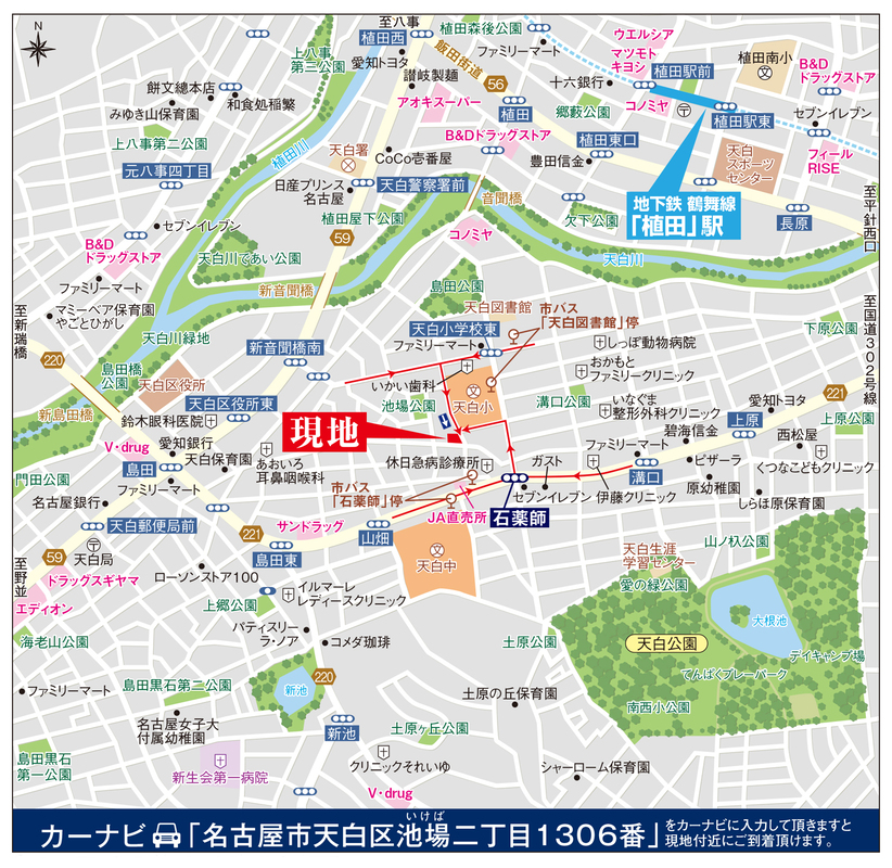 名古屋市営鶴舞線「植田」駅 徒歩17分 市バス「石薬師」 徒歩2分 名古屋市営桜通線「相生山」駅 徒歩34分 |