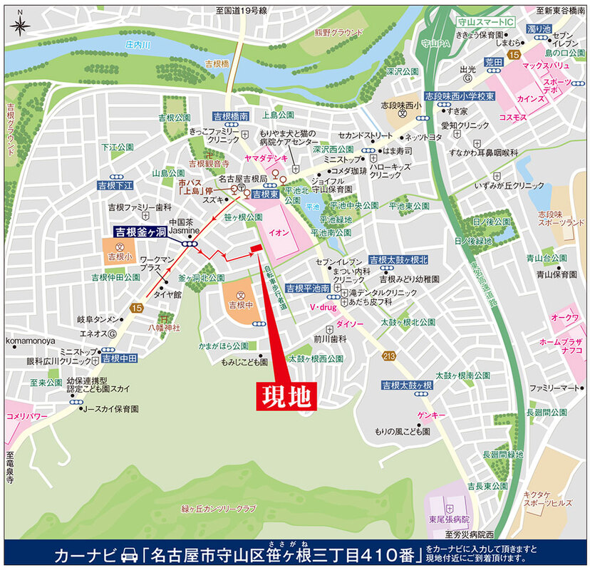 市営バス「上島」停 徒歩4分 (JR高蔵寺駅・名鉄印場駅・地下鉄砂田橋駅・大曽根駅・小幡緑地公園・東尾張病院行き) ガイドウェイバス志段味線「小幡緑地」駅 徒歩34分 JR中央本線「神領」駅 徒歩43分 |