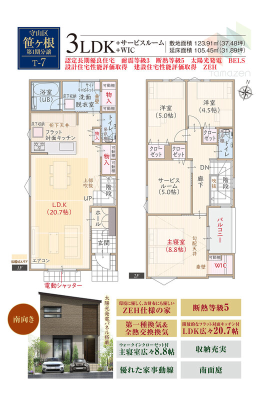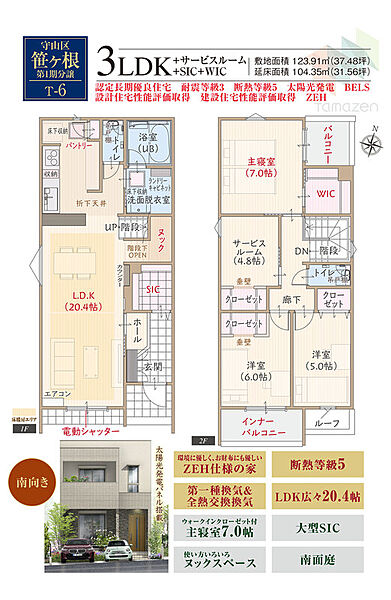 | 建物面積 | 104.35m2・105.45m2(31.56坪・31.89坪) | 土地面積 | 123.91m2(37.48坪) |