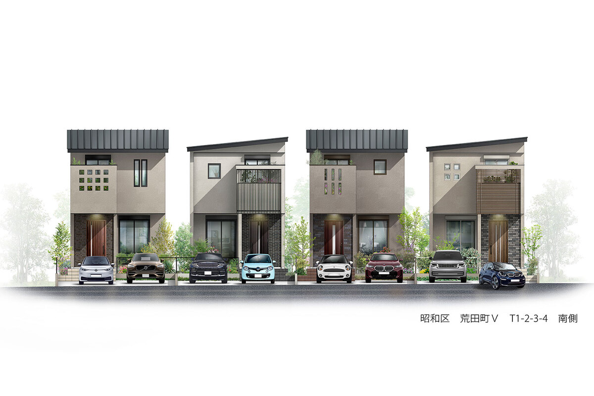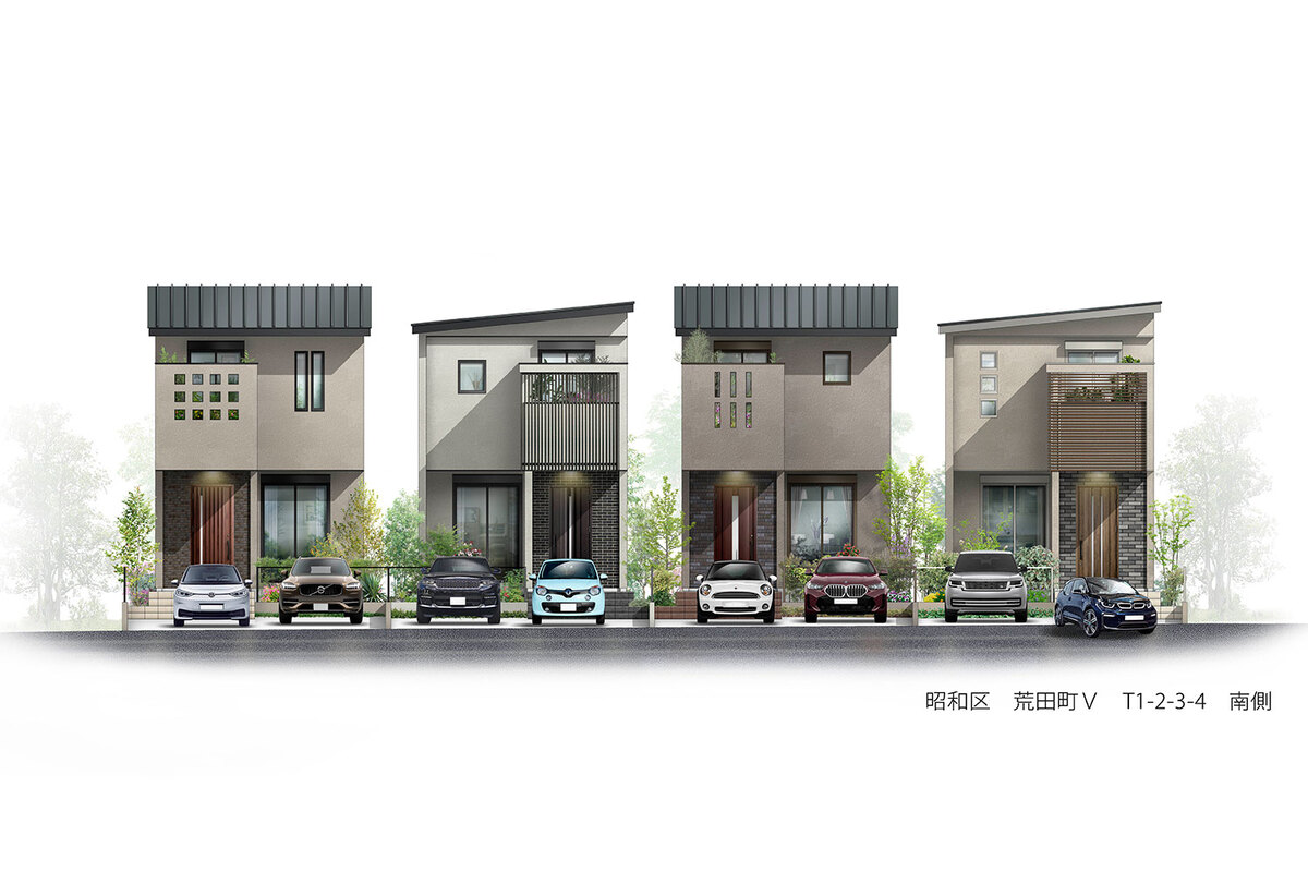 陽当たり良好な南向きの土地を選定し、全て異なったデザインと外構で構成。