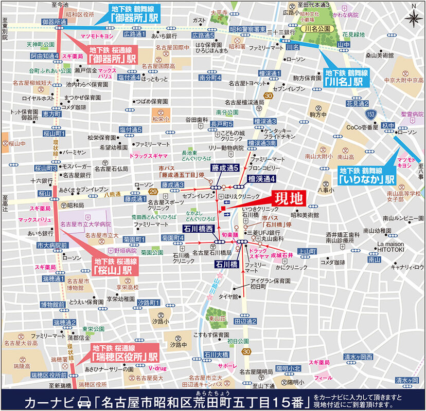 名古屋市営桜通線「桜山」駅 徒歩13分 名古屋市営鶴舞線「川名」駅 徒歩13分 市営バス「藤成通五丁目」停 徒歩2分 (地下鉄桜山駅、覚王山駅、瑞穂運動場東駅・金山駅行き) |