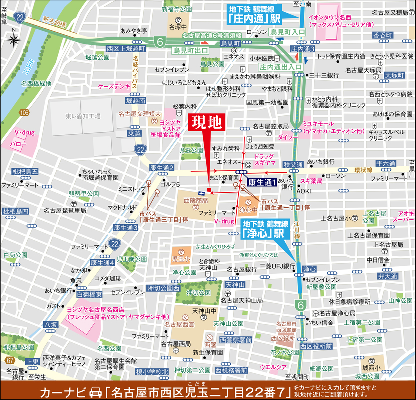 名古屋市営鶴舞線「浄心」駅 徒歩12分 市バス「康生通一丁目」停 徒歩2分 (地下鉄庄内通駅・名鉄上飯田駅・名古屋駅行き) 市バス「康生通三丁目」停 徒歩5分 (地下鉄浄心駅・名鉄栄生駅・名古屋駅・栄・名城公園行き) |