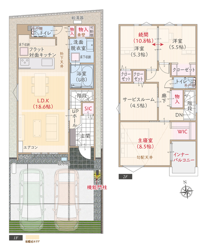 | 建物面積 | 100.21m2・102.9m2(30.31坪・31.12坪) | 土地面積 | 104.17m2・107.63m2(31.51坪・32.55坪) |