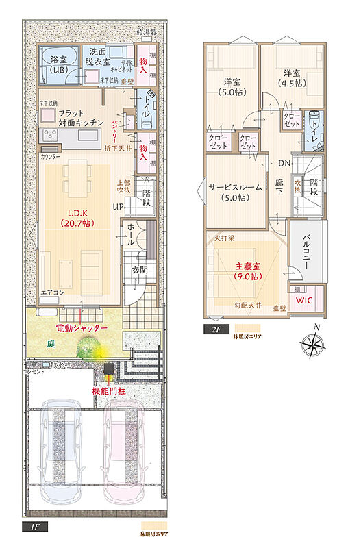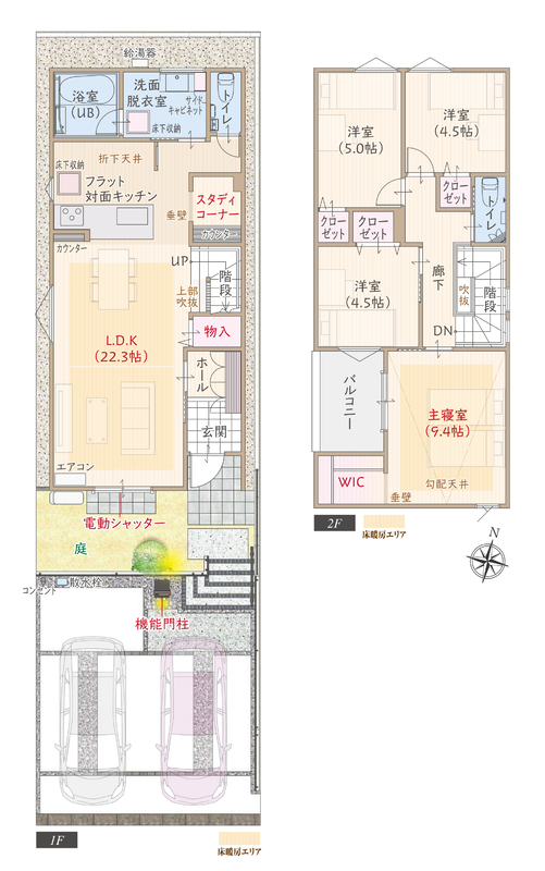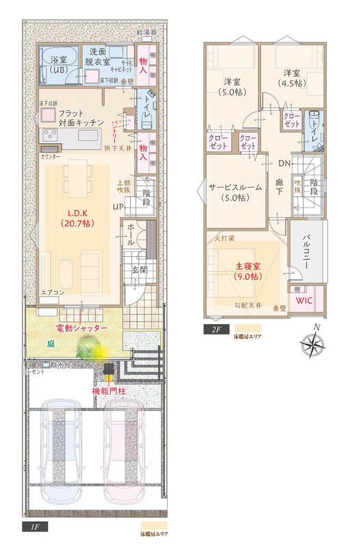 LDKエアコン/全居室カーテン&LED照明/省エネ給湯器「エコジョーズ」/浴室暖房乾燥機/床暖房/玄関大型姿見/電気自動車充電用コンセント/電動シャッター/スマートキーなど充実の標準装備
