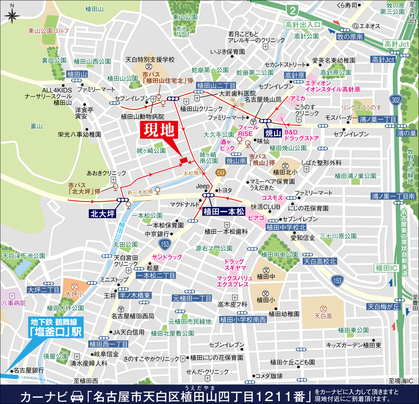 名古屋市営鶴舞線「塩釜口」駅 徒歩20分 市バス「北大坪」停 徒歩5分 (地下鉄塩釜口駅、植田駅・天白公園行き) 市バス「植田山住宅北」停 徒歩6分 (地下鉄星ケ丘駅、釜口駅、植田駅・八事日赤病院行き) |