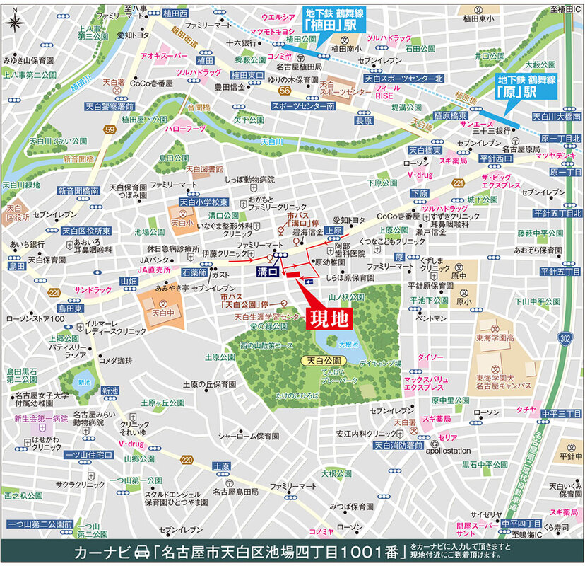 名古屋市営鶴舞線「植田」駅 徒歩15分 名古屋市営鶴舞線「原」駅 徒歩15分 市バス「天白公園」停 徒歩2分 |