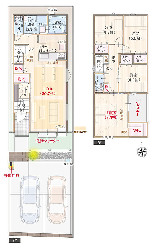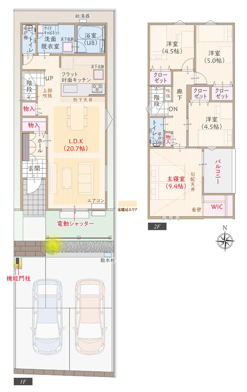 LDKエアコン/全居室カーテン&LED照明/省エネ給湯器「エコジョーズ」/浴室暖房乾燥機/床暖房/玄関大型姿見/電気自動車充電用コンセント/電動シャッター/スマートキーなど充実の標準装備