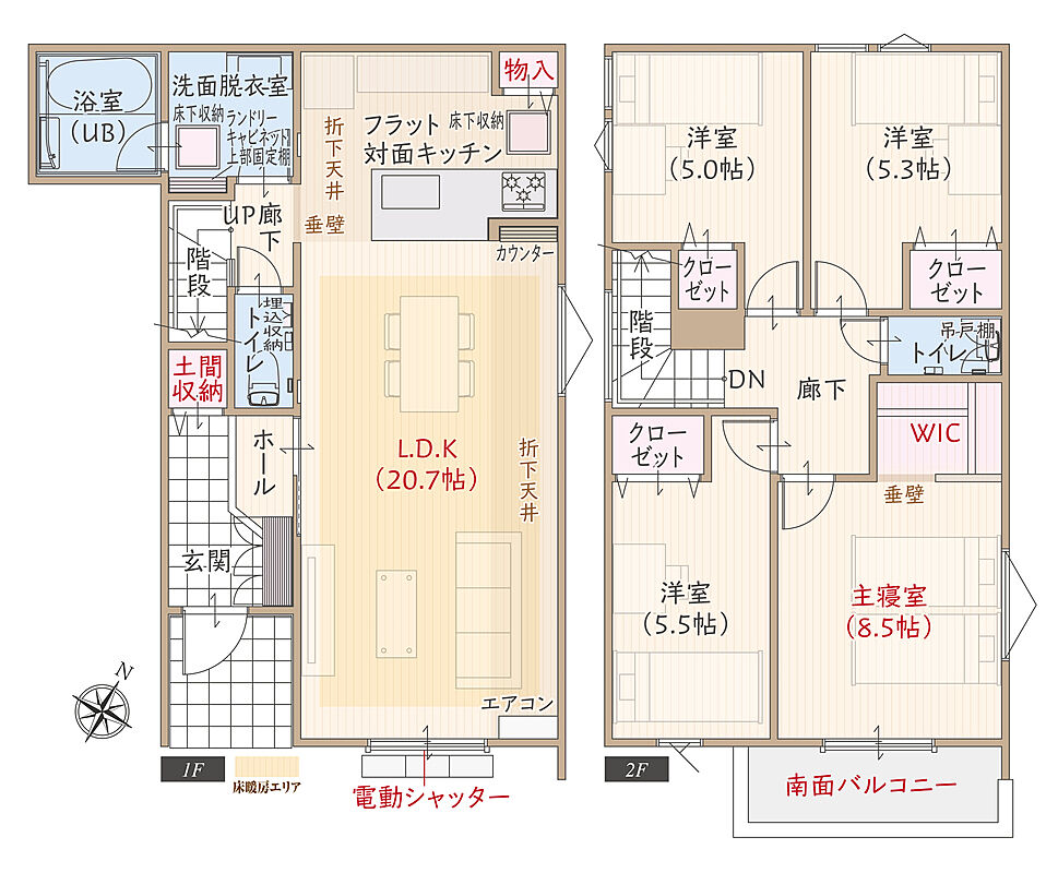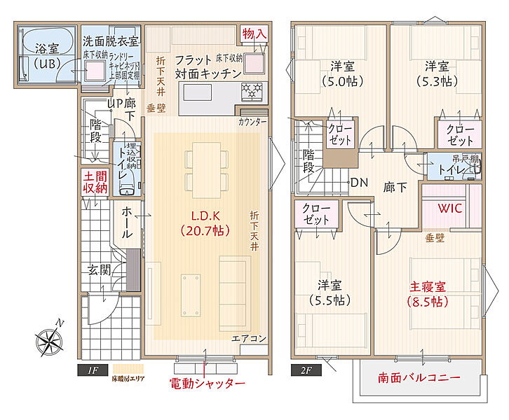 LDKエアコン/全居室カーテン&LED照明/省エネ給湯器「エコジョーズ」/浴室暖房乾燥機/床暖房/玄関大型姿見/電気自動車充電用コンセント/電動シャッター/スマートキーなど充実の標準装備