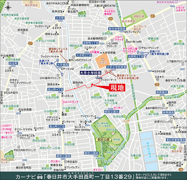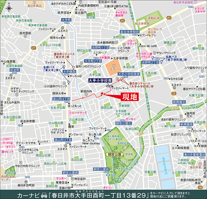 かすがいシティバス「大手小学校南」停 徒歩3分 (JR春日井駅・市役所・春日井市民病院行き) かすがいシティバス「東大手」停 徒歩6分 (JR勝川駅・城北線勝川駅・名鉄味美駅行き) 名鉄バス「東大手」停 徒歩7分 ・名鉄味美駅行き) 名鉄バス「東大手」停 |