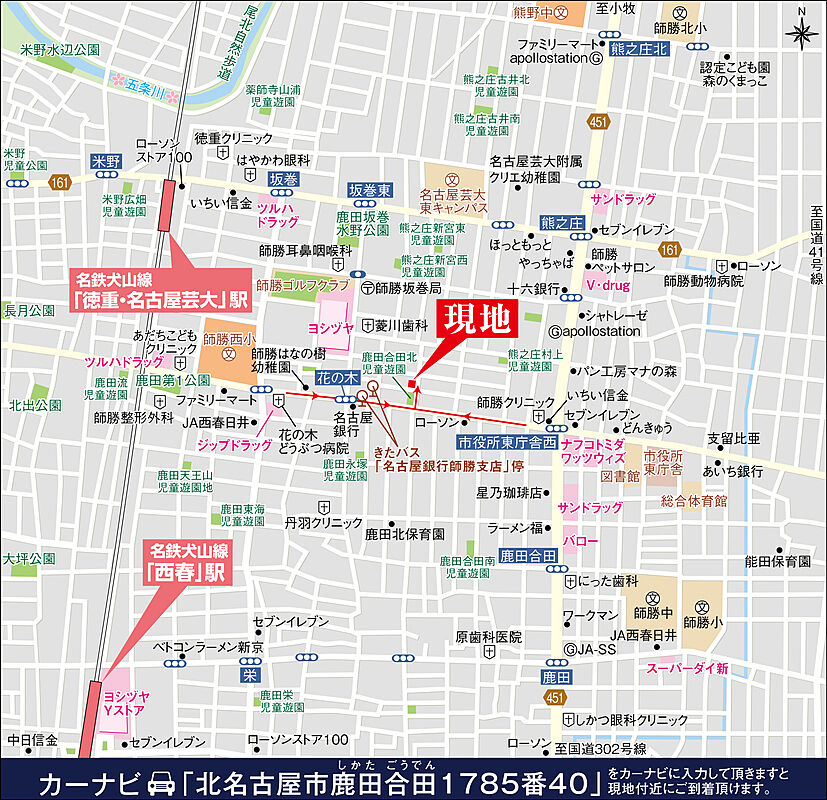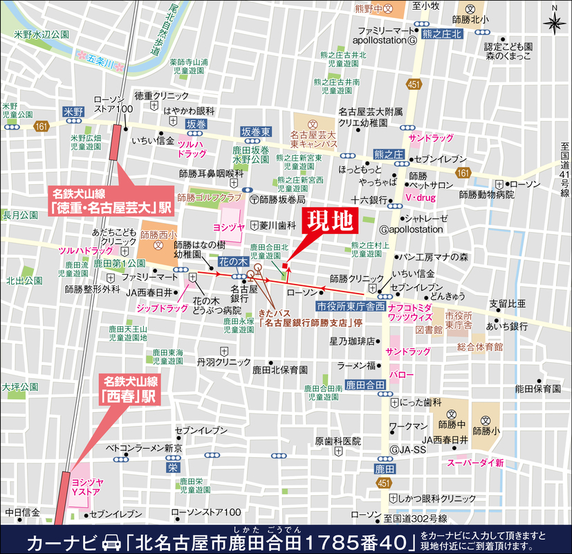 名鉄犬山線「徳重・名古屋芸大」駅 徒歩13分 名鉄犬山線「西春」駅 徒歩20分 きたバス「名古屋銀行師勝支店」停 徒歩2分 (名鉄西春駅行き) |