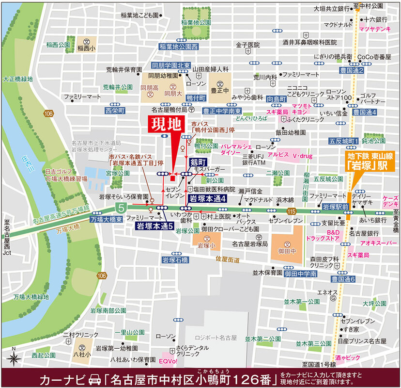 名古屋市営東山線「岩塚」駅 徒歩14分 市バス「鴨付公園西」停 徒歩3分 (地下鉄岩塚駅、本陣駅、太閤通駅・名古屋駅行き) 市バス「岩塚本通五丁目」停 徒歩3分 (地下鉄岩塚駅、中村公園駅・JR春田駅・金山行き) |